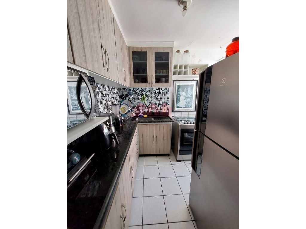 Apartamento de 2 quartos, no condomínio Recanto do Bosque 3, com 48m2, bom acabamento, piso em cerâmica clara, com armários planejados na Cozinha e na Área de Serviço.